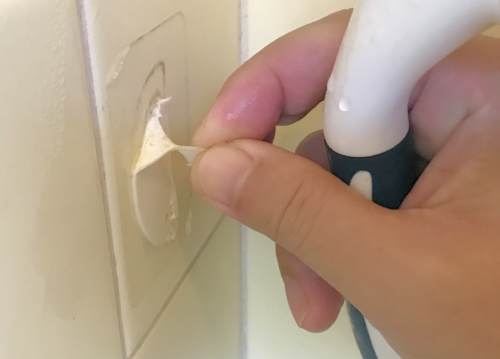 上の画像は、実際に我が家のお風呂場に取り付けてあったタオル掛けのシールを剥がしているところです。意外に簡単な方法でタイルに貼られたシールをはがすことができるのでご紹介します。