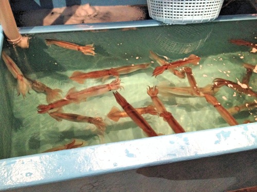店内のイケスには、元気にいかが泳いでいます。元気が良いということは、新鮮な証拠ですね。こんなイカなら、活き造りだけじゃなくて、イカ焼きにしてもむちゃくちゃ口当たりのよい食感になると想像できます。